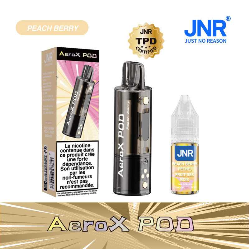 La Pod Aerox JNR Peach Berry est un modĂšle conçu pour le systĂšme AeroX de JNR. Elle contient un flacon de 10âŻml de e-liquide aux sels de nicotine (20âŻmg) et propose un volume estimĂ© Ă 32âŻ000 bouffĂ©es/puffs, selon le mode de vape.